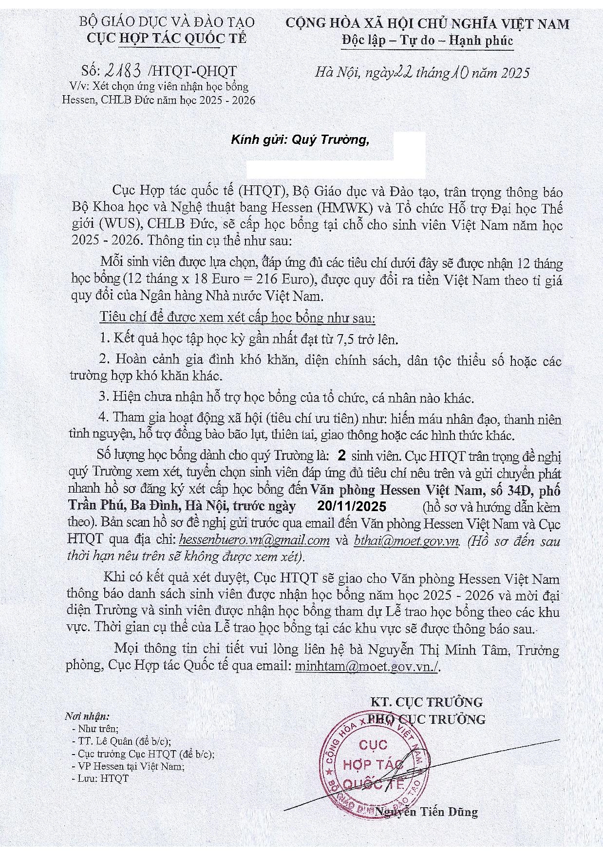 Công văn xét chọn ứng viên nhận học bổng Hessen, CHLB Đức năm học 2025 - 2026