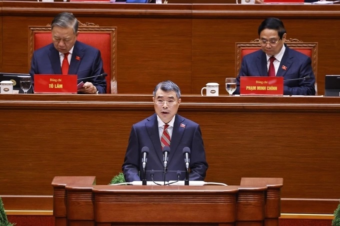 Ông Lê Minh Hưng, Ủy viên Bộ Chính trị, Bí thư Trung ương Đảng, Trưởng Ban Tổ chức Trung ương thay mặt Đoàn Chủ tịch trình bày Báo cáo của BCH Trung ương Đảng khóa XIII về công tác nhân sự BCH Trung ương Đảng khóa XIV. Ảnh: TTXVN