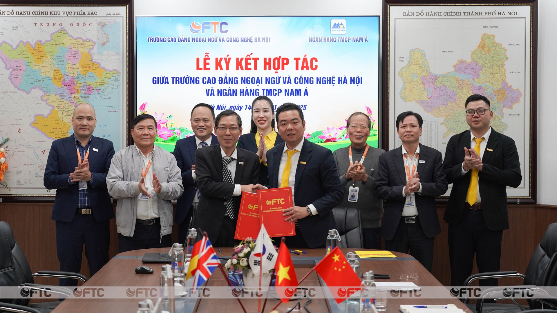 NGƯT. PGS. TS Bùi Văn Quân, Hiệu trường Trường Cao đẳng Ngoại ngữ và Công nghệ Hà Nội và Ông Phạm Xuân Sáng, Giám đốc Ngân hàng TMCP Nam Á - Chi nhánh Bắc Hà Nội cũng nhau ký kết hợp tác.