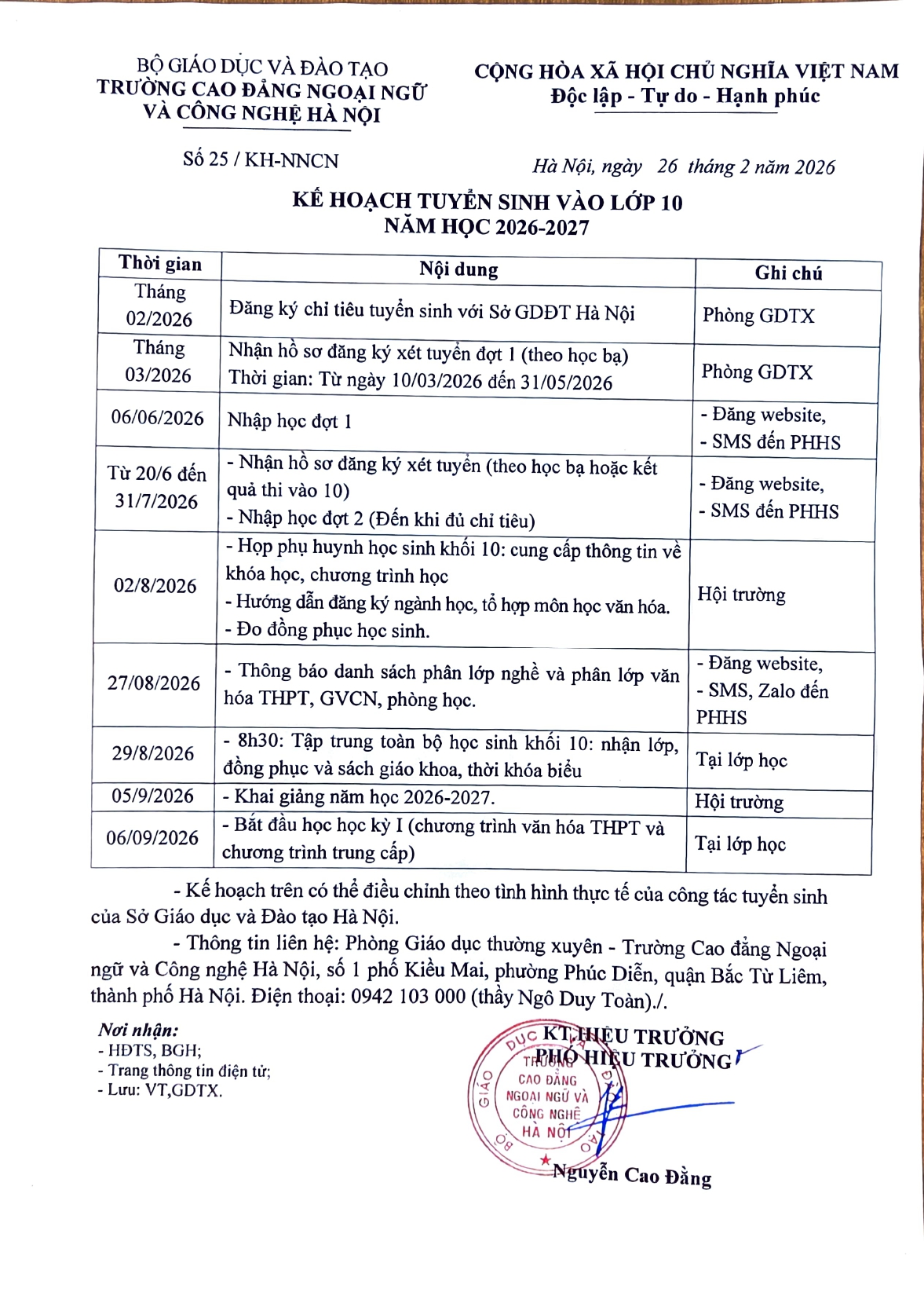 Kế hoạch Tuyển sinh vào lớp 10 năm học 2026 - 2027