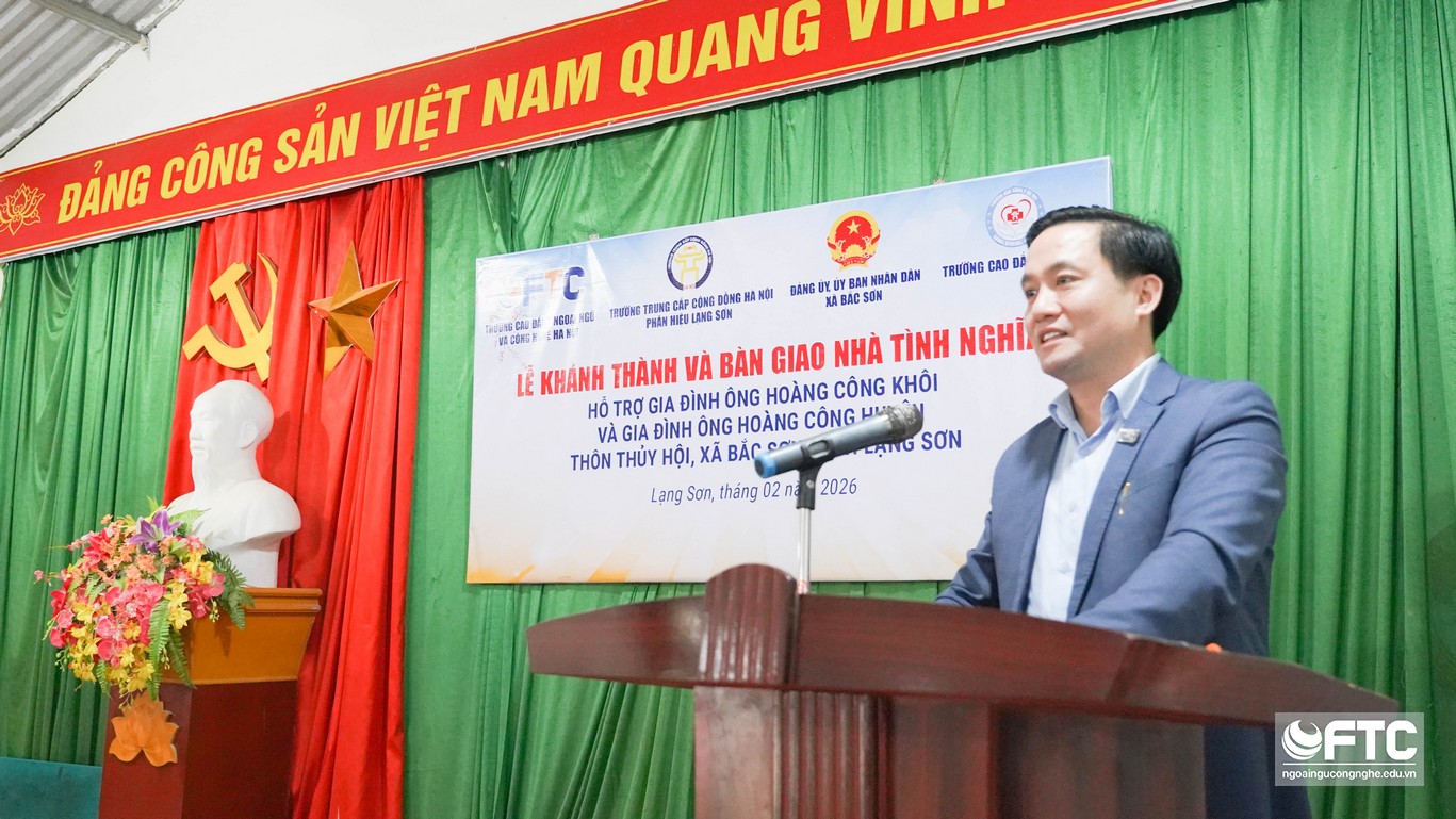 Sáng 6/2, Trường Cao đẳng Ngoại ngữ và Công nghệ Hà Nội (FTC), Trường Cao đẳng Y Hà Nội - Cơ sở đào tạo Mỹ Đình (HMC), Trường Trung cấp Cộng đồng Hà Nội - Phân hiệu Lạng Sơn (HCC) và Đoàn Cảnh sát Đặc nhiệm số 1 - Bộ Tư lệnh Cảnh sát cơ động phối hợp với Đảng uỷ, UBND xã Bắc Sơn tổ chức lễ khánh thành nhà tình nghĩa cho gia đình ông Hoàng Công Khôi và gia đình ông Hoàng Công Huyên, cùng trú tại thôn Thủy Hội, xã Bắc Sơn.