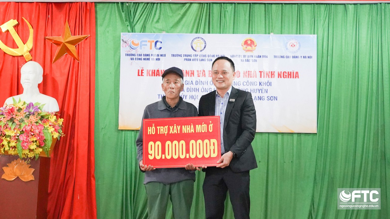 ThS. Nguyễn Duy Hân - Phó Hiệu trưởng Trường Cao đẳng Ngoại ngữ và Công nghệ Hà Nội trao biển biểu trưng hỗ trợ xây nhà cho gia đình ông Hoàng Công Khôi