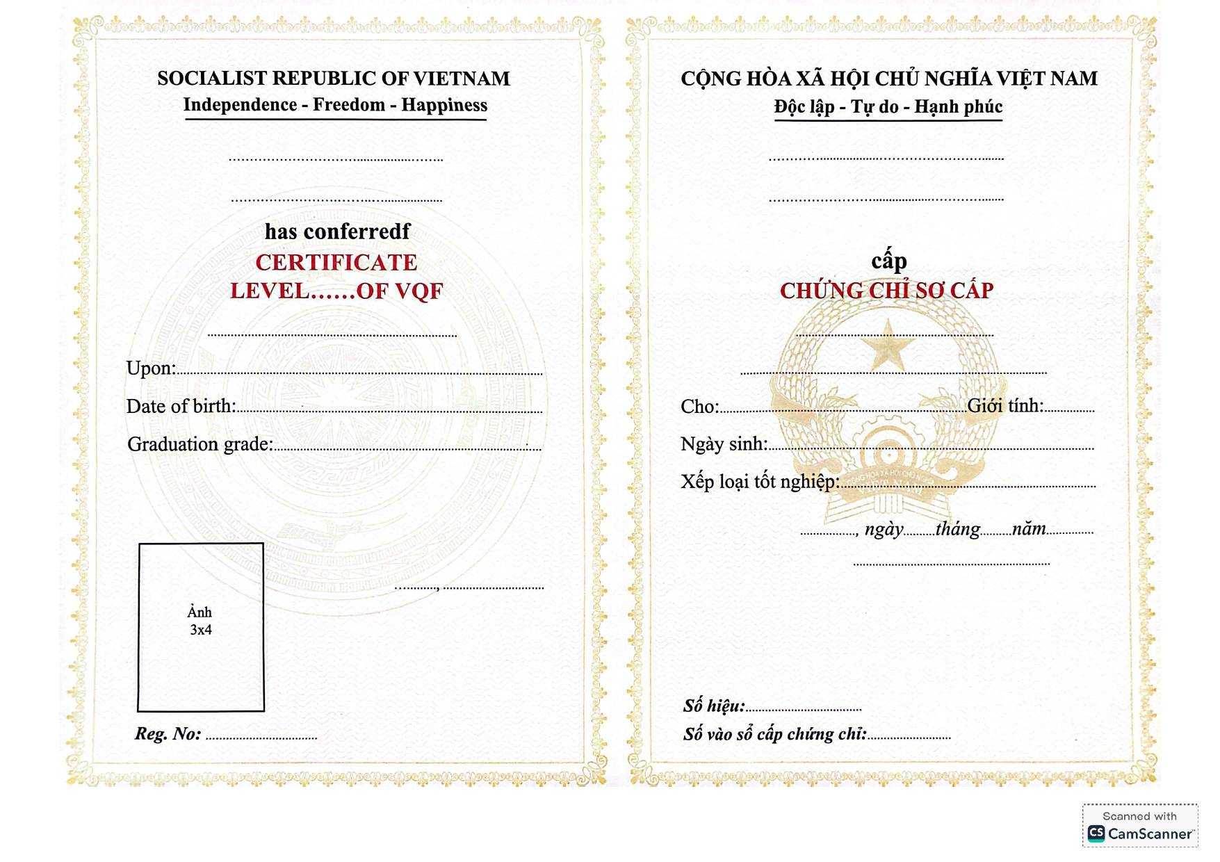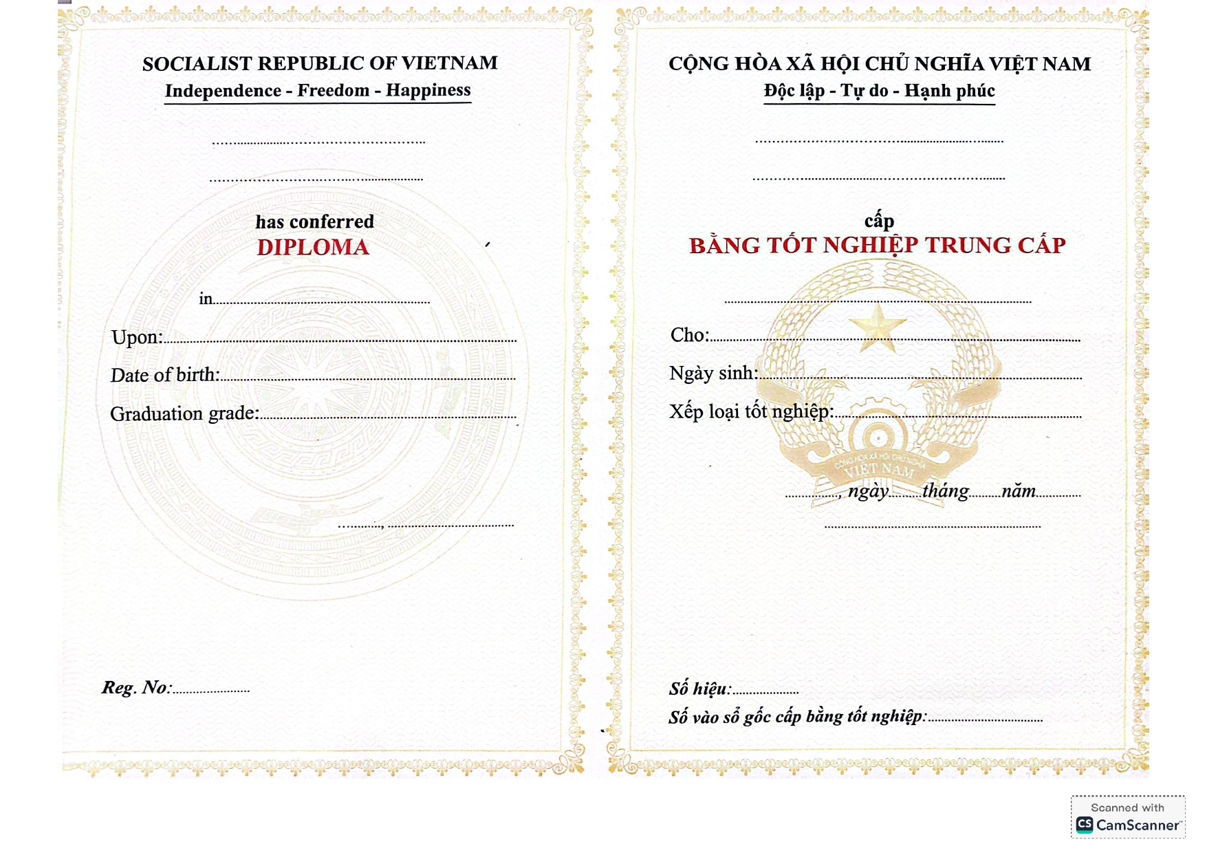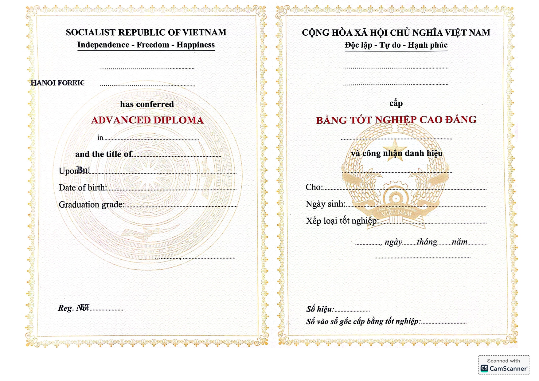 Mẫu phôi bằng Trường Cao đẳng ngoại ngữ và Công nghệ Hà Nội