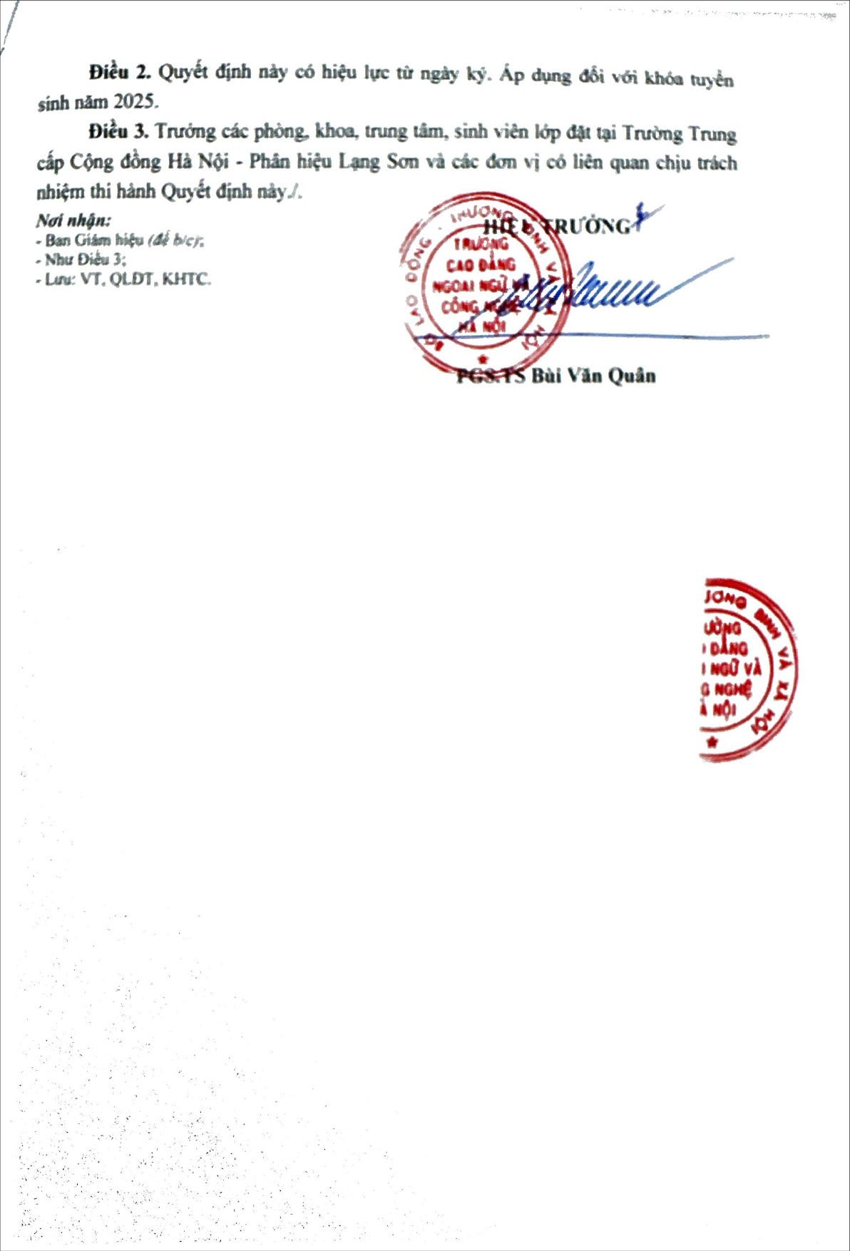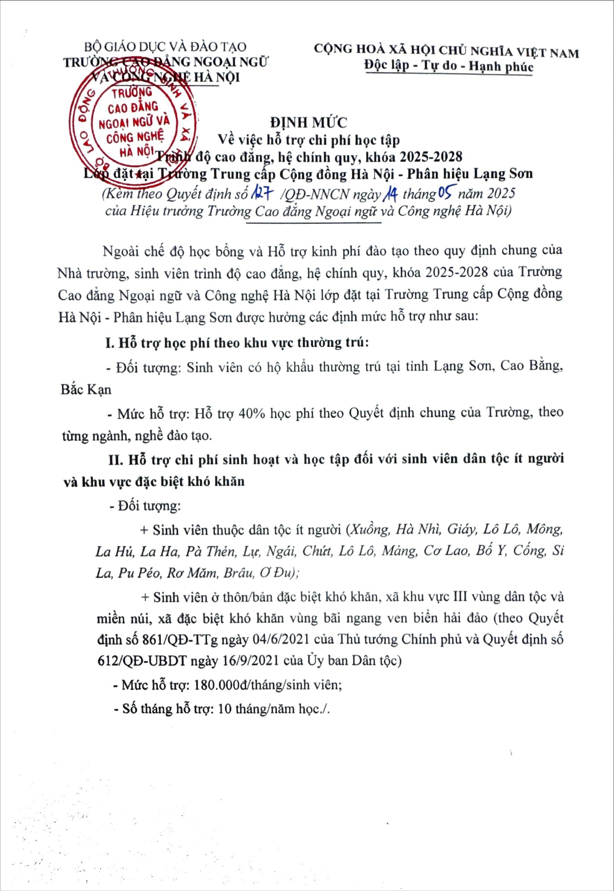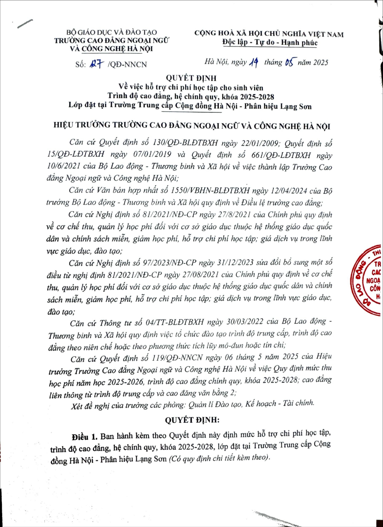 Quyết định về việc hỗ trợ chi phí học tập cho sinh viên trình độ cao đẳng hệ chính quy khóa 2025 - 2028 lớp đặt tại Trường Trung cấp Cộng đồng Hà Nội - Phân hiệu Lạng Sơn