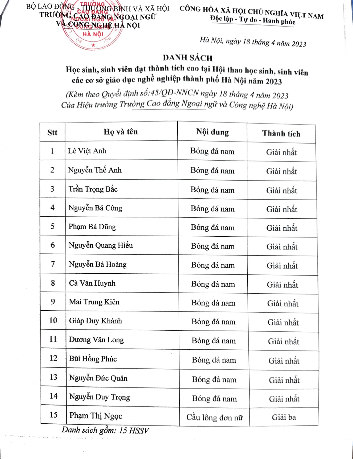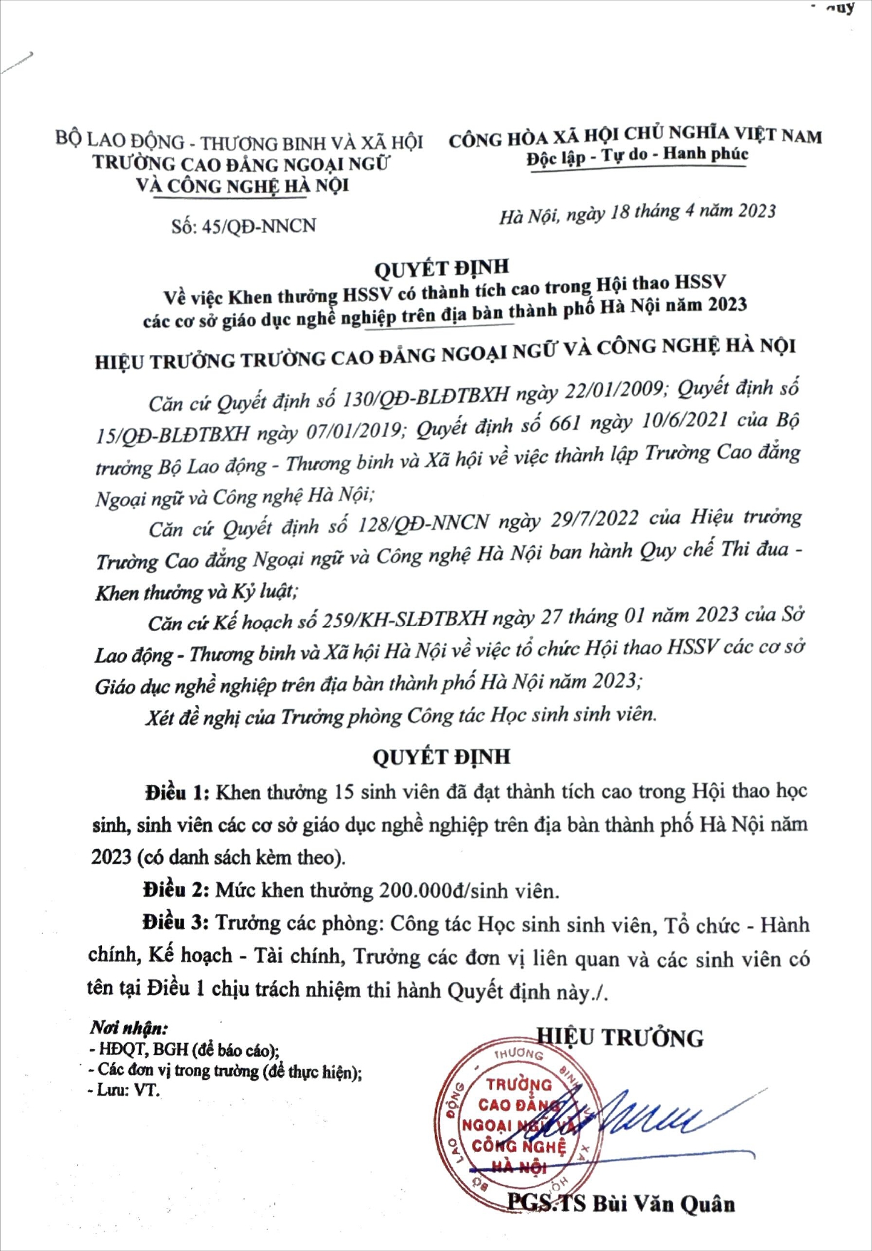 Quyết định về việc khen thưởng HSSV có thành tích cao trong Hội thao Học sinh sinh viên các cơ sở giáo dục nghề nghiệp trên địa bàn thành phố Hà Nội năm 2023