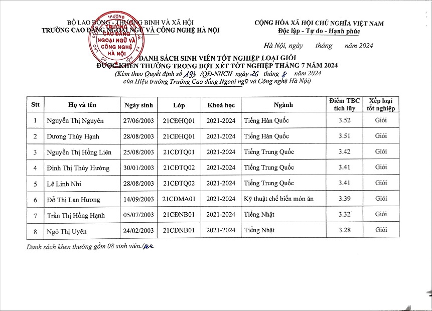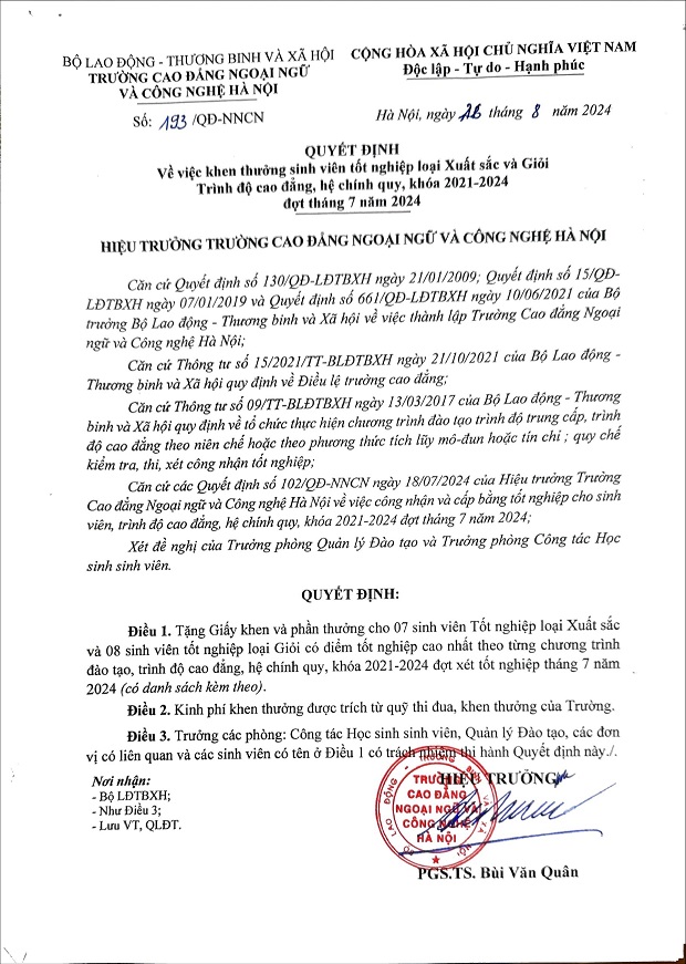 Quyết định về việc khen thưởng sinh viên CĐCQ tốt nghiệp loại Xuất sắc và Giỏi khóa 2021 - 2024, đợt xét tháng 7 năm 2024