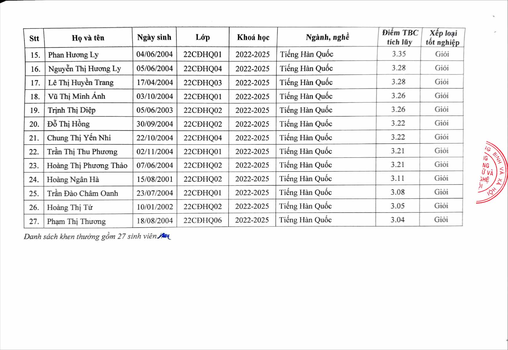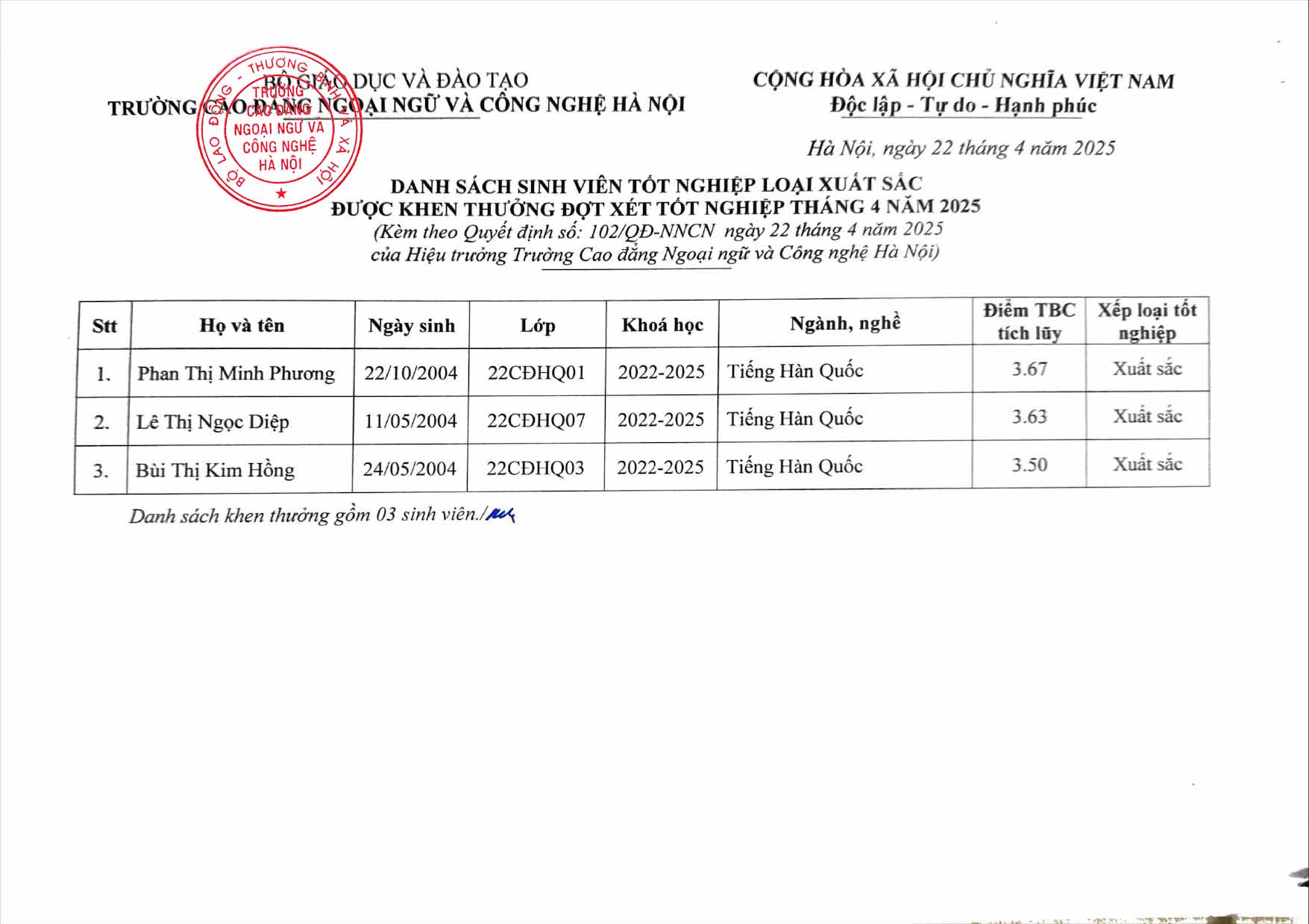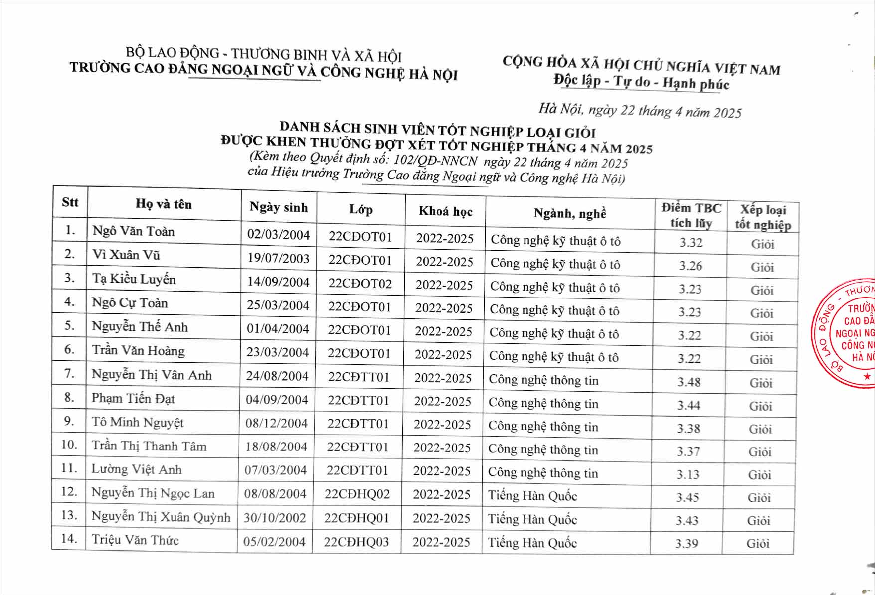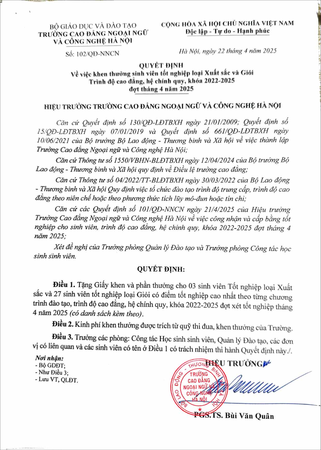 Quyết định về việc khen thưởng sinh viên CĐCQ tốt nghiệp loại Xuất sắc và Giỏi khóa 2022 - 2025, đợt xét tháng 4 năm 2025