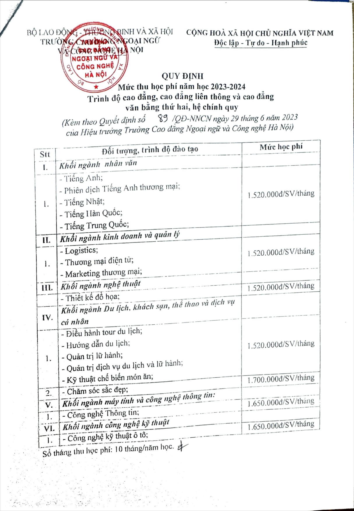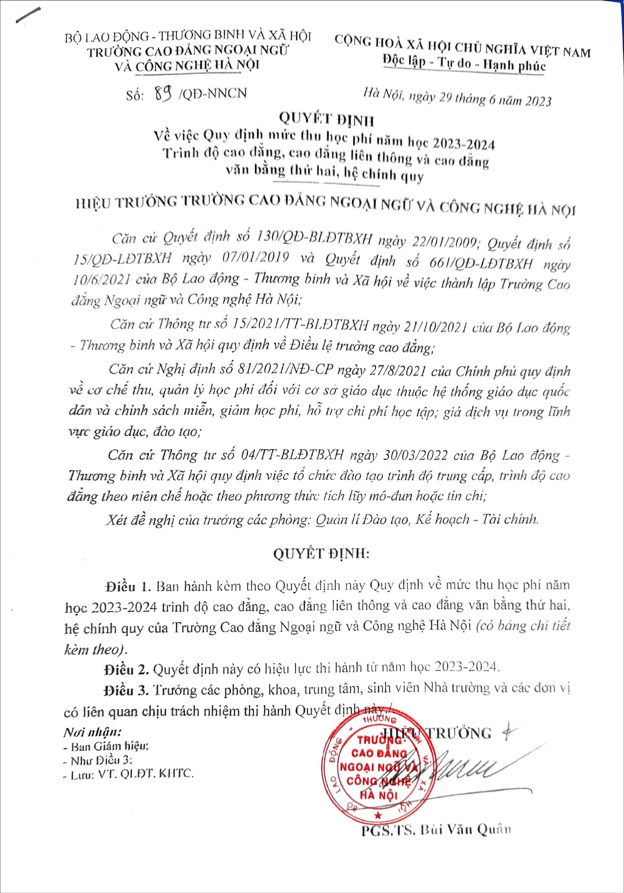 Quyết định về việc Quy định mức thu học phí năm học 2023 - 2024 trình độ cao đẳng, cao đẳng liên thông và cao đẳng văn bằng 2, hệ chính quy
