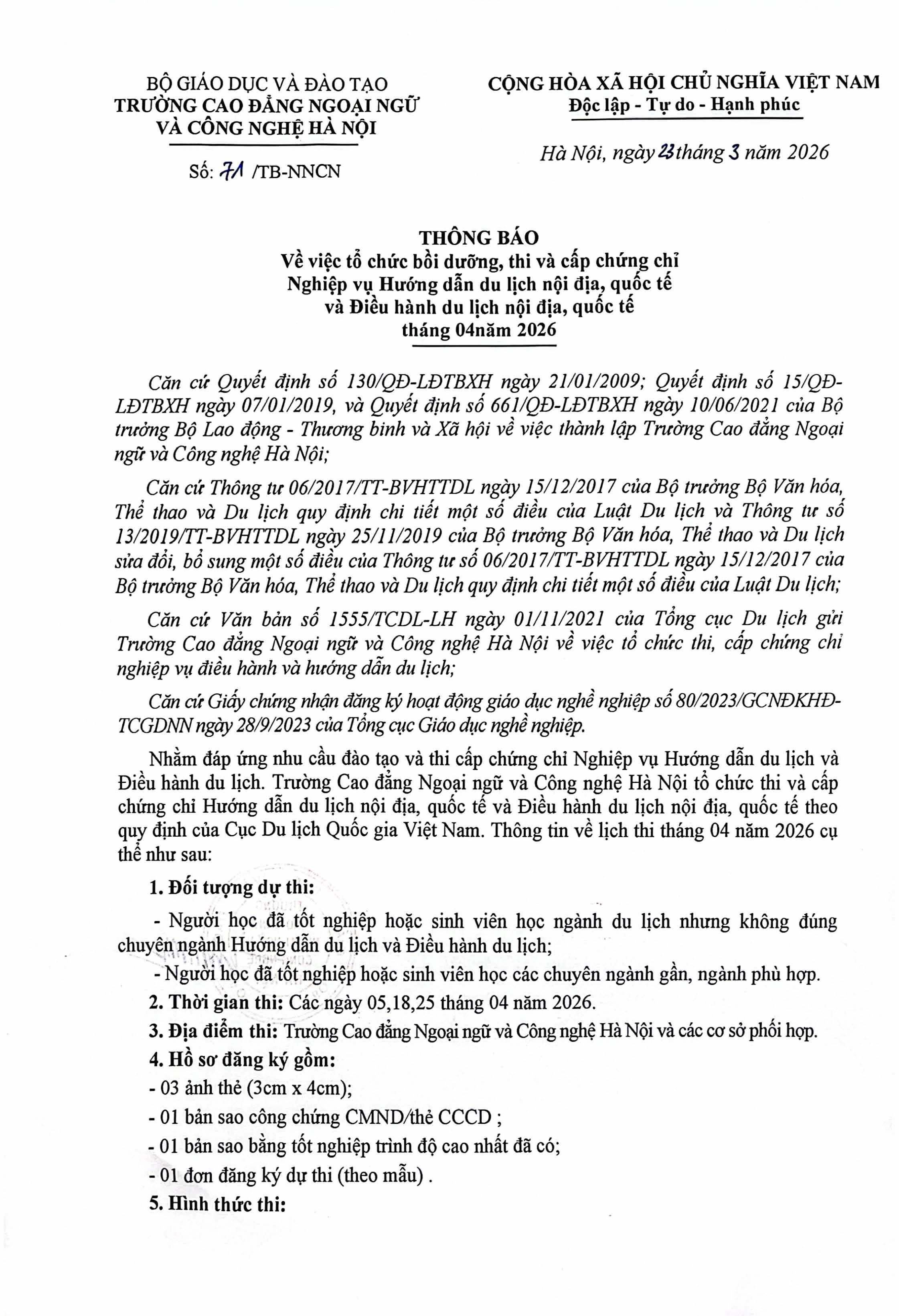 Thông báo về việc Bồi dưỡng, thi và cấp chứng chỉ Nghiệp vụ Hướng dẫn du lịch và Điều hành du lịch nội địa và quốc tế (Đợt thi Tháng 04/2026)