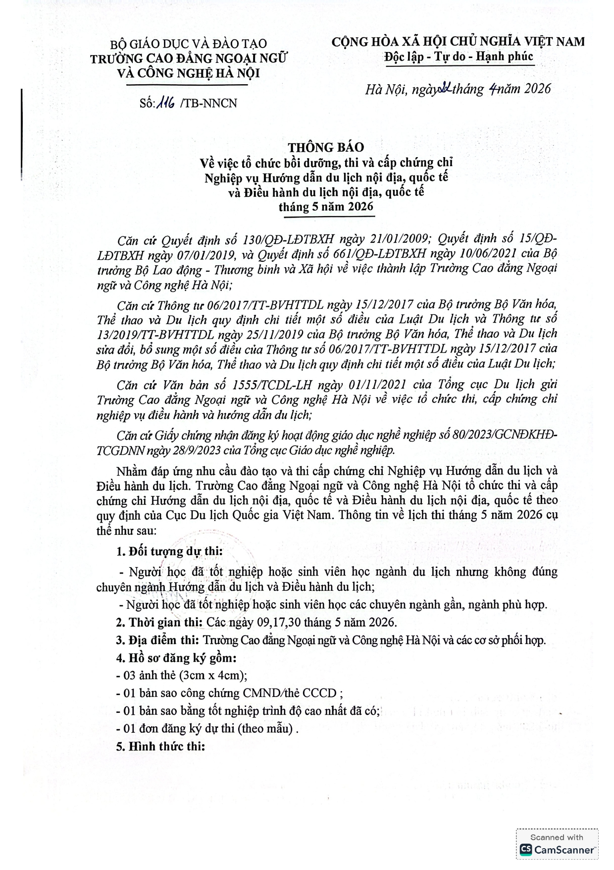 Thông báo về việc Bồi dưỡng, thi và cấp chứng chỉ Nghiệp vụ Hướng dẫn du lịch và Điều hành du lịch nội địa và quốc tế (Đợt thi Tháng 05/2026)