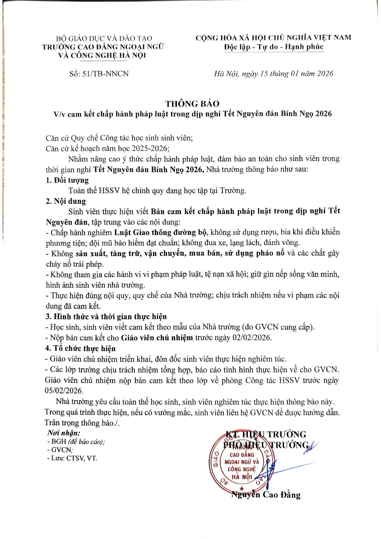 Thông báo về việc cam kết chấp hành pháp luật trong dịp nghỉ Tết Nguyên đán Bính Ngọc 2026