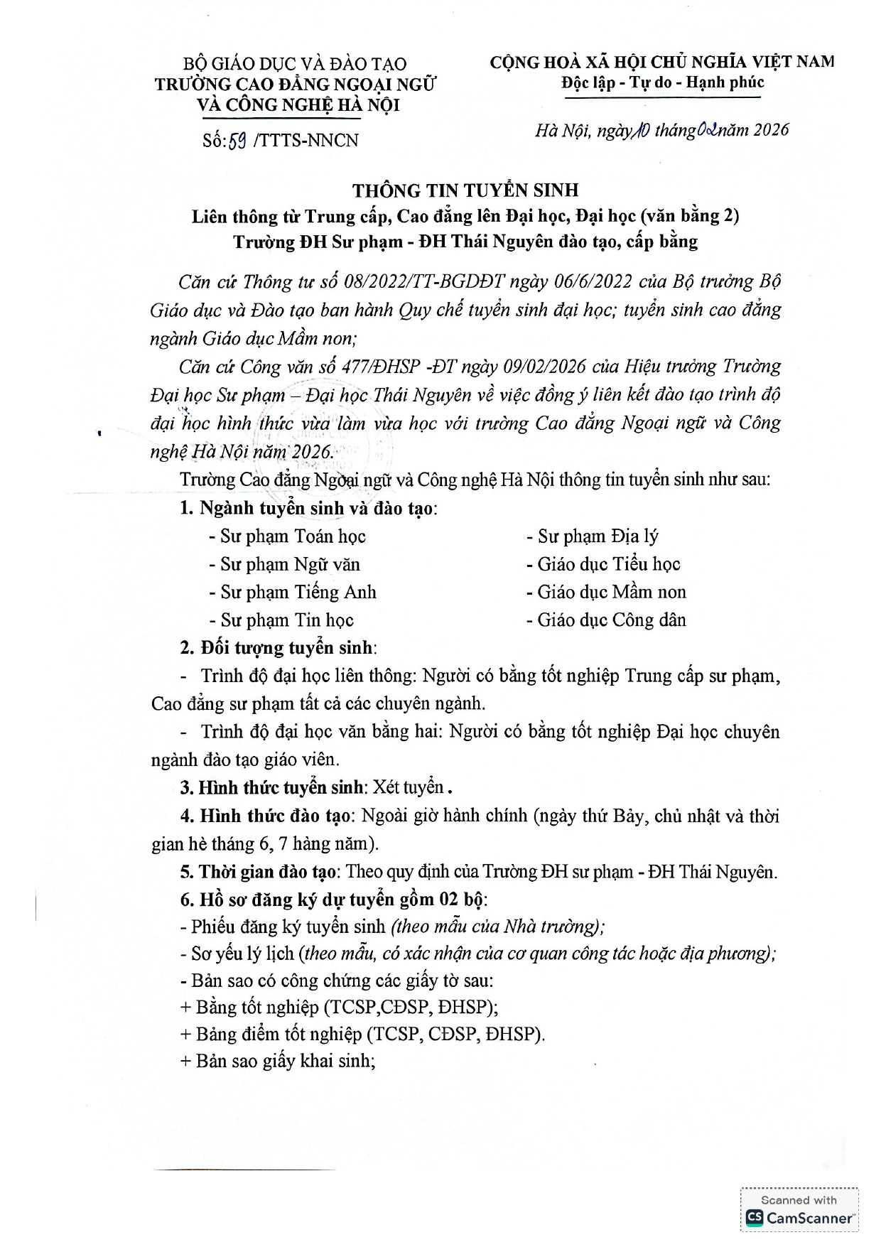 Thông báo Tuyển sinh liên thông từ trung cấp lên cao đẳng và cao đẳng văn bằng 2 hệ chính quy năm 2026