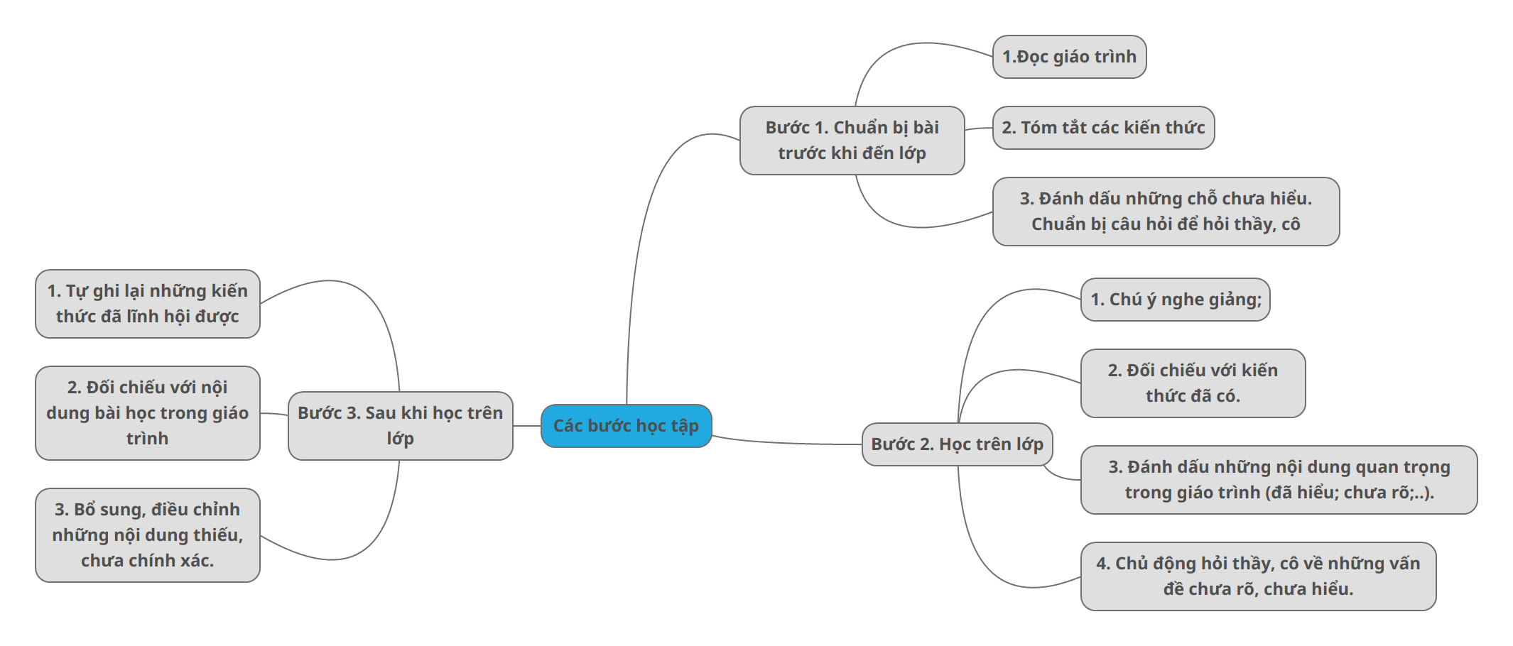 Có thể tóm tắt các bước học tập bằng Mind map như sau: